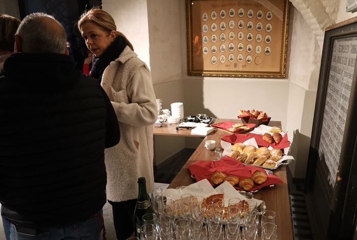 Vanochtend werden de marktkramers beloond met een ontbijt op de benedenverdieping van het stadhuis.