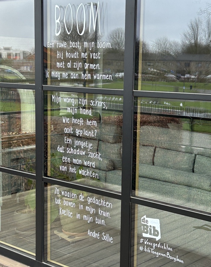 Tijdens de jaarlijks Poëzieweek slaan tientallen bibliotheken, samen met honderd dichters, de handen in elkaar om van Vlaanderen één grote poëziebundel te maken. In Tongeren-Borgloon doken de afgelopen week op diverse plaatsen gedichten op in het straatbeeld n.a.v. het project ‘Weesgedicht zoekt Adoptieraam”.