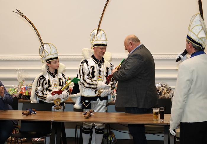 Vanavond was er de Machtsafstand van de stadsprinsen in de feestzaal van het stadhuis. Commandeur Frank Grotars blikte terug op carnaval '26: "De prinsen zijn op een mooie wijze geïnstalleerd. De Velinx was volledig gevuld. Welk optreden kan uitpakken met 2.500 bezoekers in één weekend? Zaterdag waren er niet enkel carnavalisten aanwezig, maar ook fans van de artiesten. Het was een goede mix met o.a. wereldster Johny Logan. Ook zondag zat het goed vol voor Mega Mindy. Het hoogtepunt blijft natuurlijk de stoet: De Jeugdstoet telde 24 groepen, het meeste ooit! Er waren meer dan 600 deelnemers die de koude hebben getrotseerd. Zondag is er meer sneeuw gevallen dan er voorspeld was. Een carnavalist kan gelukkig heel veel trotseren. Er is massaail uitgegooid. Iedereen ging met volle zakken naar huis. Zowel zaterdag als zondag was het goed in het feestpaviljoen. Ook dinsdag. We hebben gekozen voor een verkleedbal en dat is goed aangeslagen. Er was een wedstrijd met 2 leuke winnaars. Voor de prinsen is het nog niet afgelopen: zaterdag trekken ze naar Mechelen-Bovelingen en zondag naar Borgloon. We kunnen terugkijken op een heel degelijke carnaval. Het aantal Tongerse groepen is de laatste jaren afgenomen. Vroeger waren ze met 30? dit jaar met 17. Het is vandaag niet simpel om een vereniging in stand te houden", wist Frank.