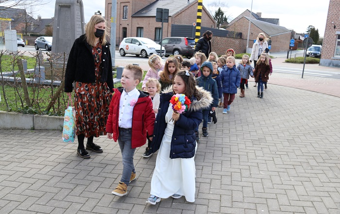 Elodie en Finn trokken met hun klasgenoten in stoet naar de kerk.