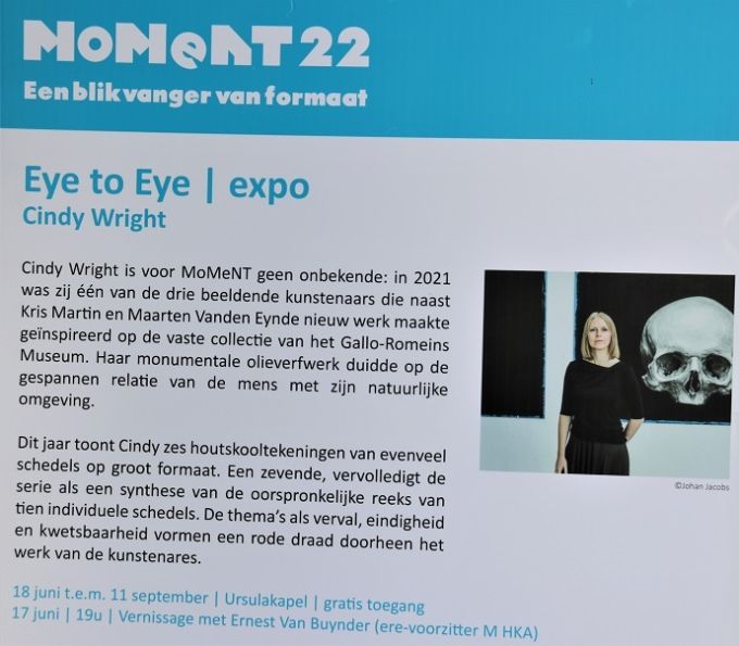 Vanavond was er de vernissage van de expo 'Eye to Eyei' in de Ursulakapel. Cindy Wright (50) uit Herentals stelt er 6 houtskooltekeningen tentoon van evenveel schedels op groot formaat. De zevende is een RX-opname, een synthese van de oorspronkelijke reeks van tien schedels op mekaar.
