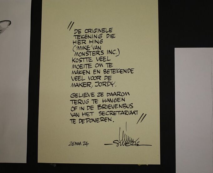 Eén van de werken is de voorbije week ontvreemd! Wim Swerts heeft de open plek opgevuld met een oproep om de tekening van cursist Jordy terug te bezorgen