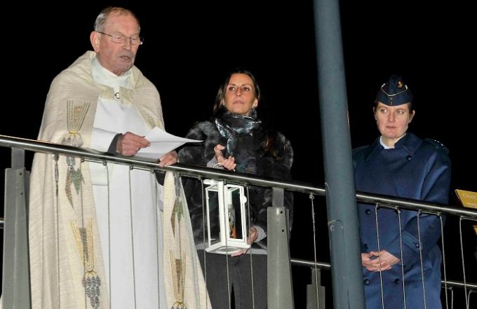 Kolonel D'Hondt mocht de lantaarn op de loopbrug van de Moerenpoort overhandigen aan An Christiaens die hem op haar beurt doorgaf aan deken Rik Palmans.