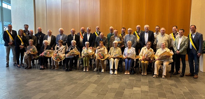 Namiddag werden de huwelijksjubilarissen van april door het stadsbestuur gehuldigd in de foyer van cc de Velinx. Er waren 10 koppels present:
