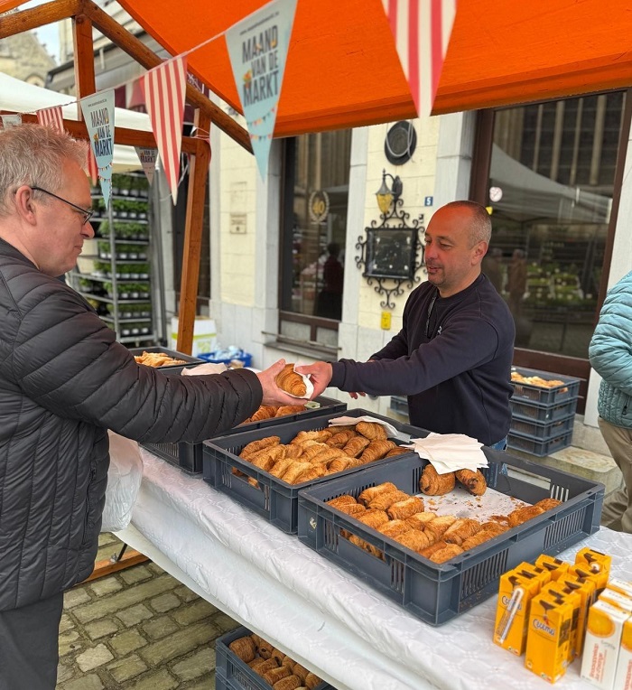 Het kraam met croissants en koeken staat opgesteld op het Vrijthof, vóór café Gerechtshof. De marktleiders zorgen voor de bedeling.