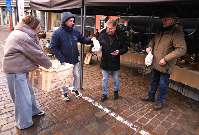 Burgemeester Jo Feytons en economieschepen Krijn Henrotte trokken mee op pad samen met de 'Economiekes' en een marktleider om de zakjes uit te delen. Bakkerij Fastré zorgde voor de 400 croissants en 400 koffiekoeken. Daarnaast was er ook een bon voor een gratis koffie bij één van de omliggende Horecazaken. De bon blijft geldig tot 1 maart. "We willen de standhouders bedanken voor hun inzet en aanwezigheid en we wensen hun succes voor 2026. Nieuwjaarswensen uitdelen kan normaal tot eind januari, maar deze zondag valt nu op 1 februari", vertelde de schepen.