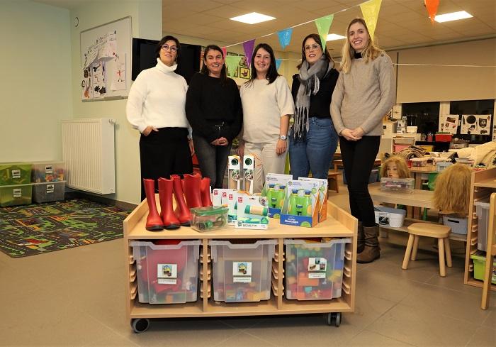 "We hebben er materiaal voor buiten mee aangekocht: o.a. rubberlaarsjes, .verrekijkers en rubberen tegels voor onder de speeltuigen", vertelde schoolhoofd Goele. "De rest van het bedrag besteden we aan een roltafel en een tuinset op kindermaat".