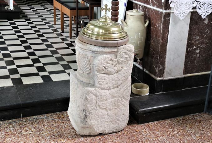 Het doopvont is een topstuk. Je ziet o.a. een pamfluit, een afbeelding van de god Bacchus en vleugels. Deze kalksteen is afkomstig uit Metz.